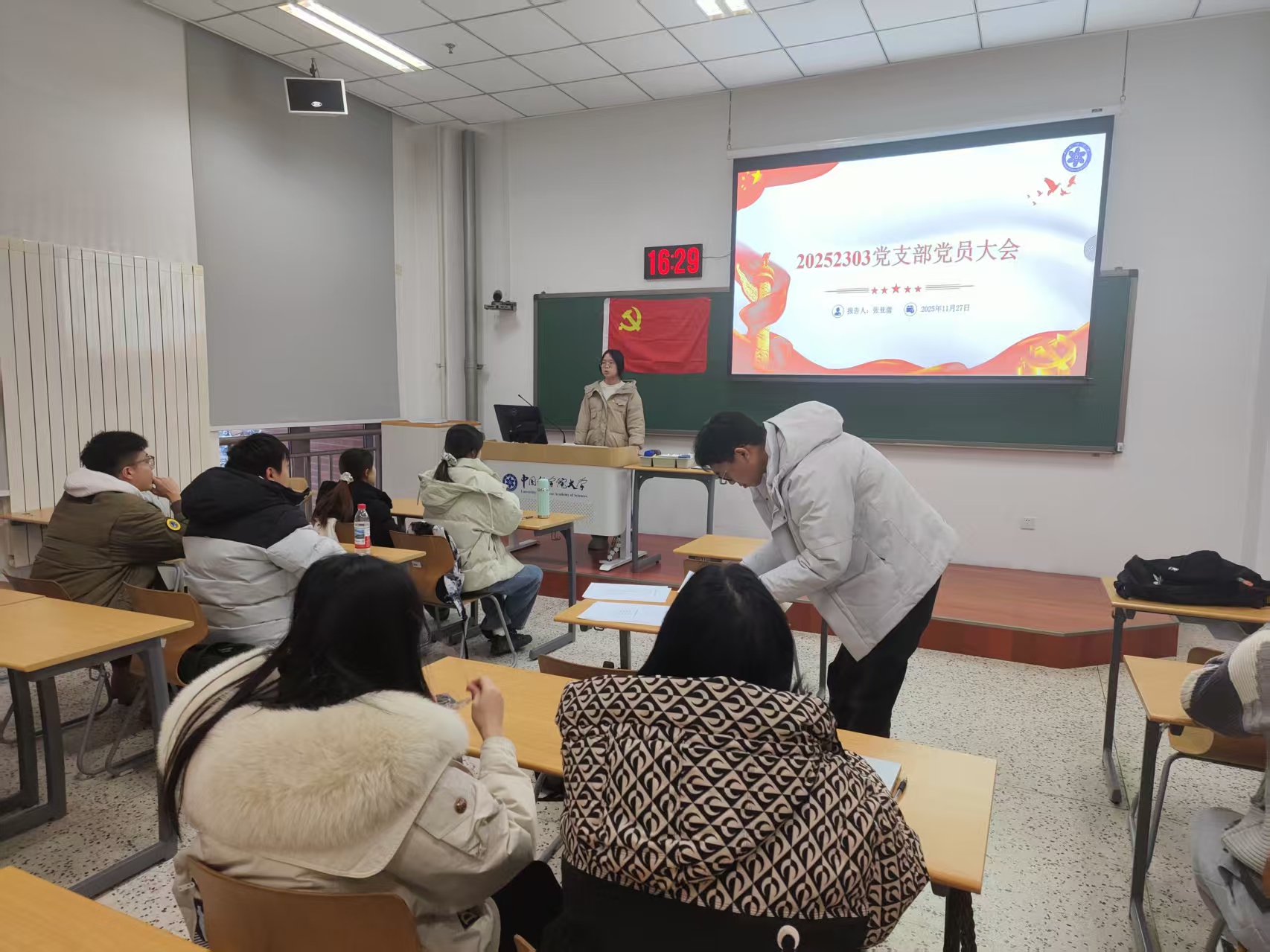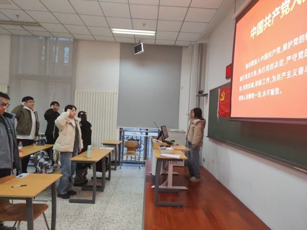 2025年11月27日,中国科学院大学纳米工程学院20252303党支部召开专题大会,党支部书记张亚蕾主持会议,党支部全体党员参会,会议围绕“重温入党宣誓”与“党员转正流程安排”以及“党员党章党史考试”三大核心议题展开。